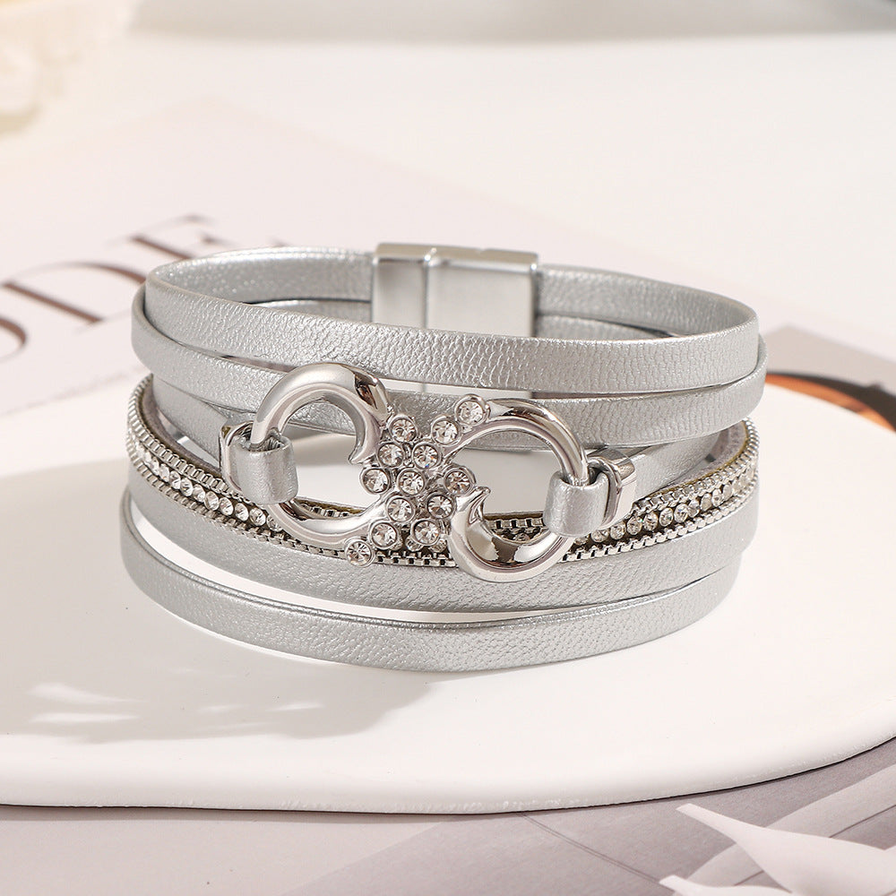 This bracelet embodies a design philosophy that marries sleek minimalism with glamorous detailing. It’s created to be a refined statement piece, where the polished metallic hardware, sparkling crystal accents, and layered leather straps converge to exude an air of modern sophistication.